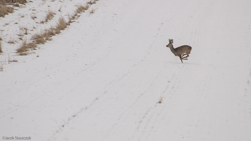 Gdy zbliżaliśmy się do lasu, w pobliżu miejsca gdzie uwolniłem schwytaną sarnę, pojawiła się cała ich grupka. Po chwili dołączyły kolejne które wyszły z lasu i stado zaczęło uciekać. Jednak po chwili zakręciło i zaczęło nas mijać w bliższej odległości, późnij jeszcze jeden zakręt i minęły nas o kilkanaście metrów, pozując do zdjęć. Po tym już się oddaliły: